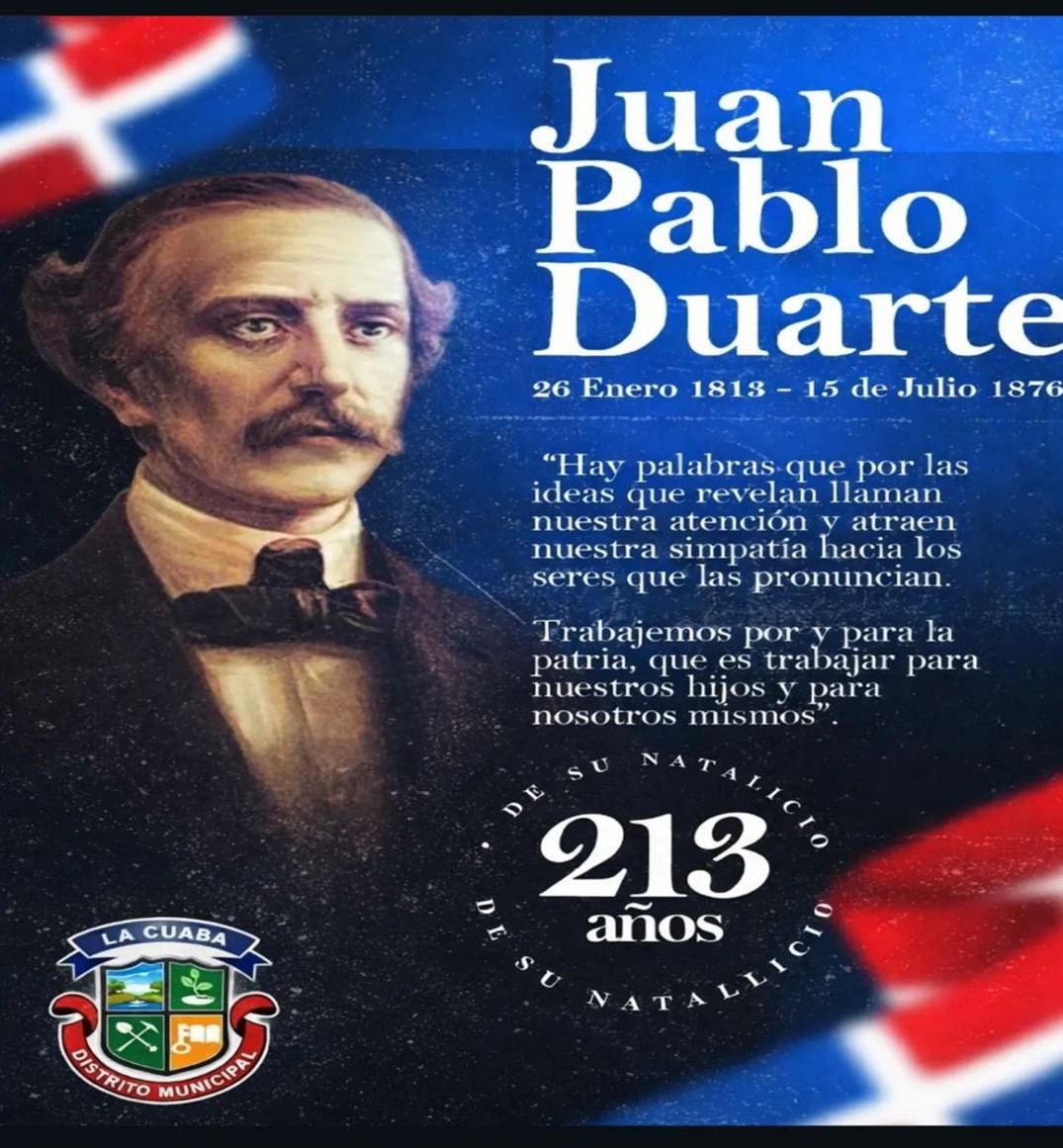 Hoy honramos el legado del padre de la patria, juan pablo duarte a sus 213 años de su natalicio, Su vision, valentia y amor por la libertad siguen siendo luz y guia para nuestra nacion.